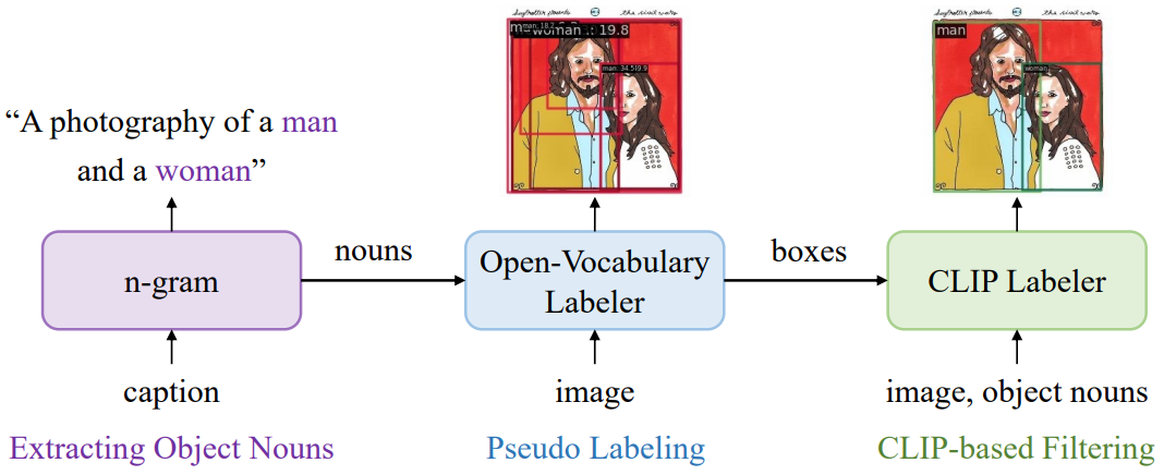 - 사전 훈련된 CLIP을 통해 관련성이 낮은 pair를 필터링, NMS를 통해 중복 박스 필터링