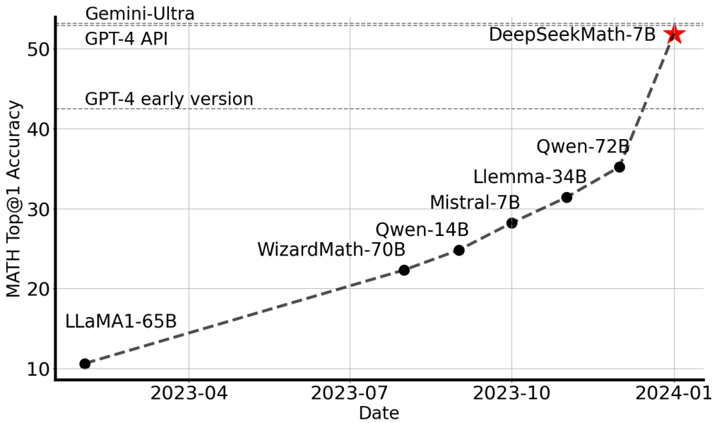 DeepSeekMath-Base 7B는 DeepSeek-Coder-Base-v1.5 7B 가중치로 초기화되어 DeepSeekMath Corpus로 훈련됨.