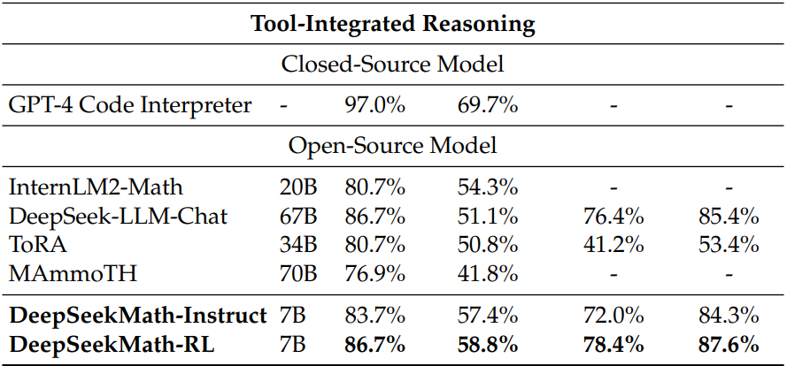 - DeepSeekMath-Base 7B를 통해 고품질 데이터로 훈련된 작은 모델이 강력한 성능을 달성할 수 있음을 보여줌