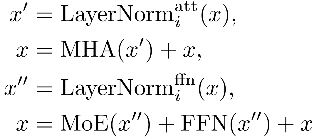 MoE는 FFN에 대한 잔차 방식으로 배치된다. 또한 효율성을 위해 모든 레이어에 사용하지 않고 4~6 레이어마다 한 번씩 사용한다.