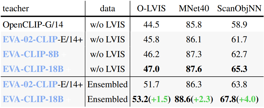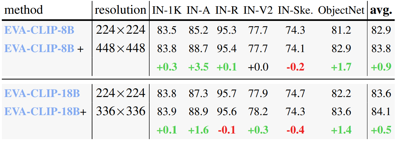 EVA-02-CLIP-E/14+를 교사로 EVA-02를 18B까지 확장하고 데이터셋은 대부분 고정된 상태로 유지된다.