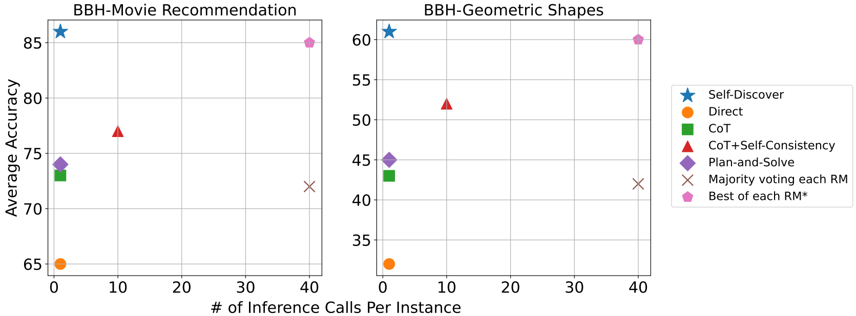 Chain of Thought (CoT), CoT-Self-Consistency와 같은 방법들보다 10~40배 적은 컴퓨팅 능력을 사용하면서 성능은 더 뛰어나다.