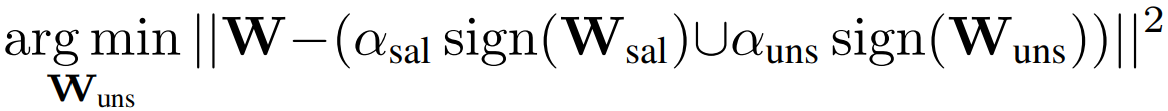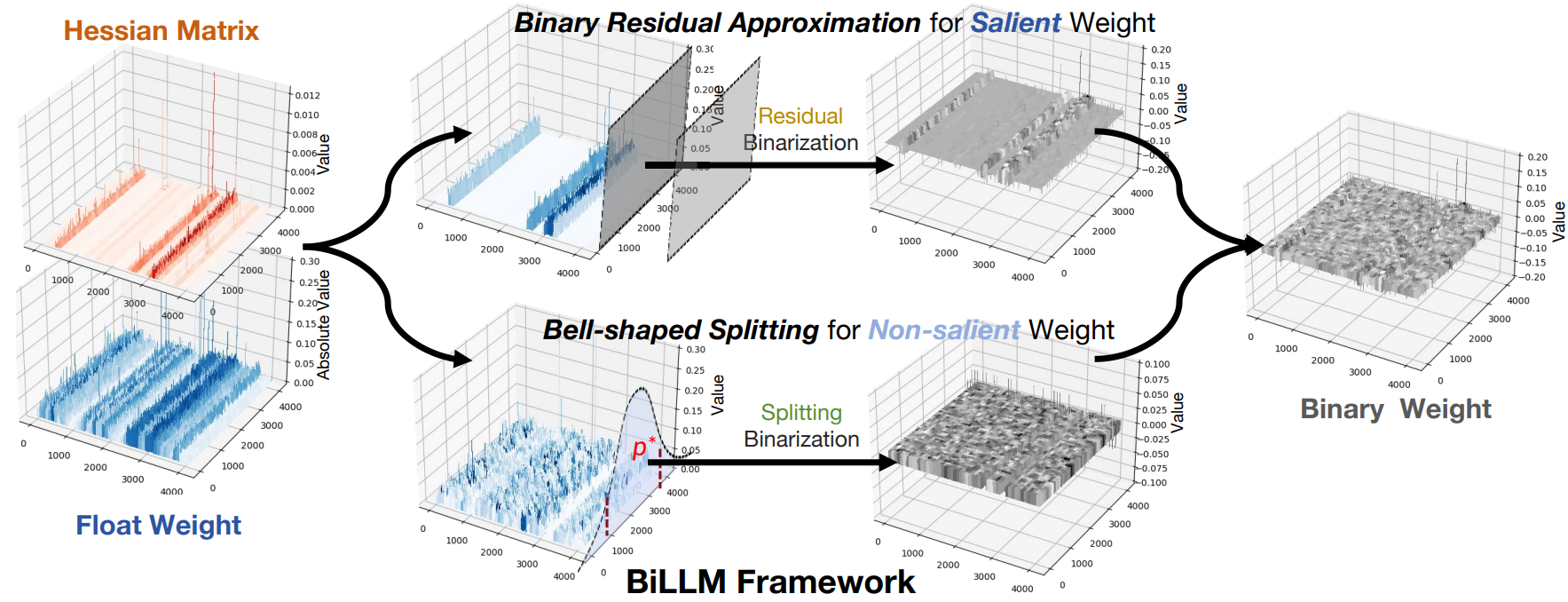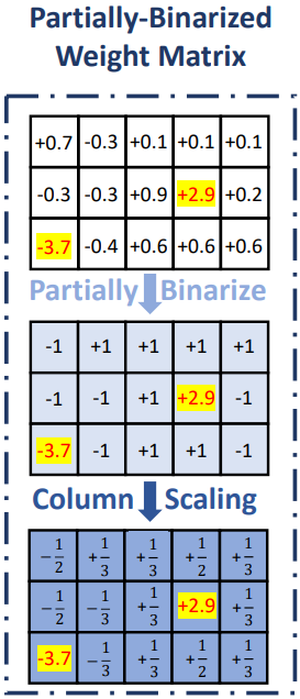돌출된 가중치를 보존하면 이진화의 이점이 약화된다. 양자화 오류를 최소화하며 이진화하기 위한 새로운 접근법.
