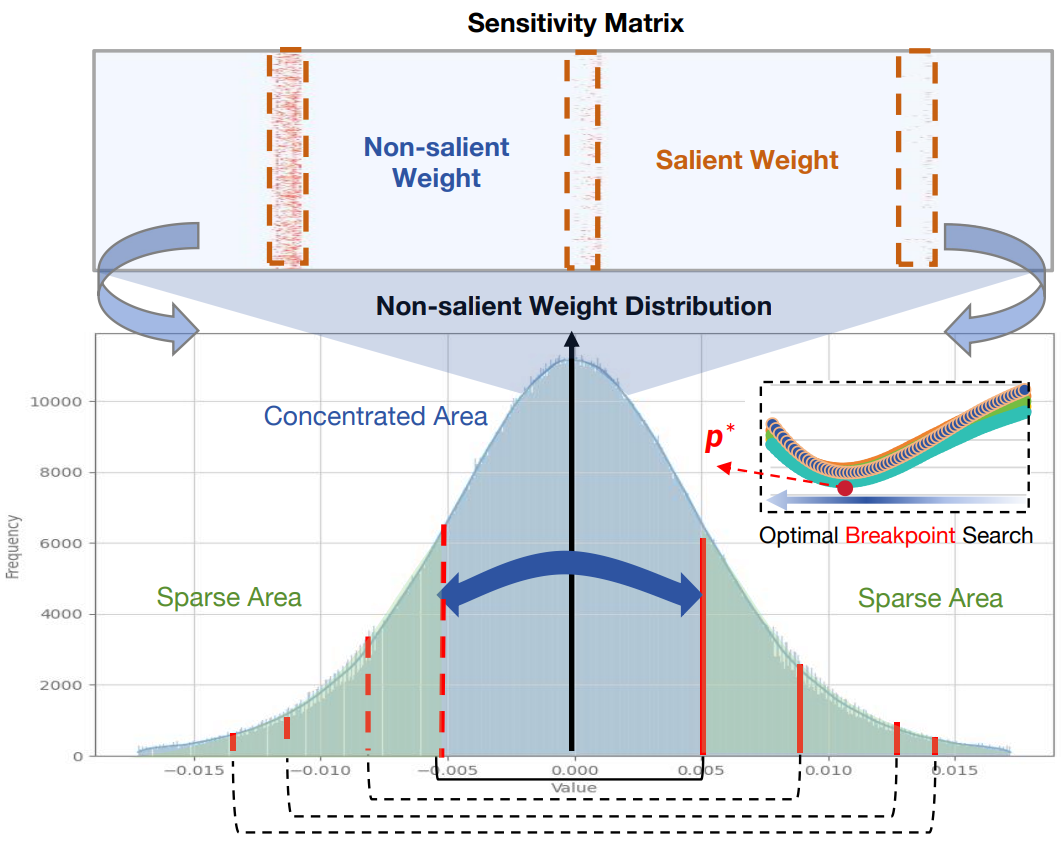 이는 대부분의 가중치가 중복적이고 소수의 가중치가 중요한 역할을 한다는 것을 의미하며 공격적인 양자화를 가능하게 한다.