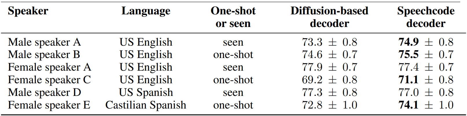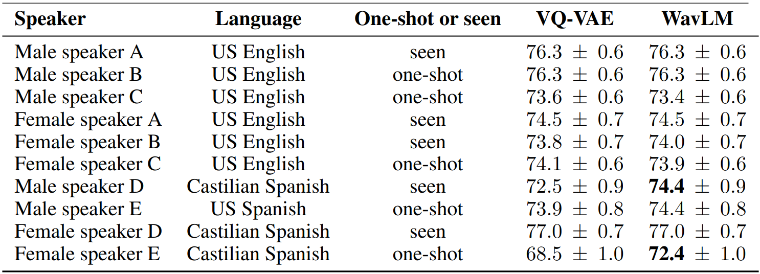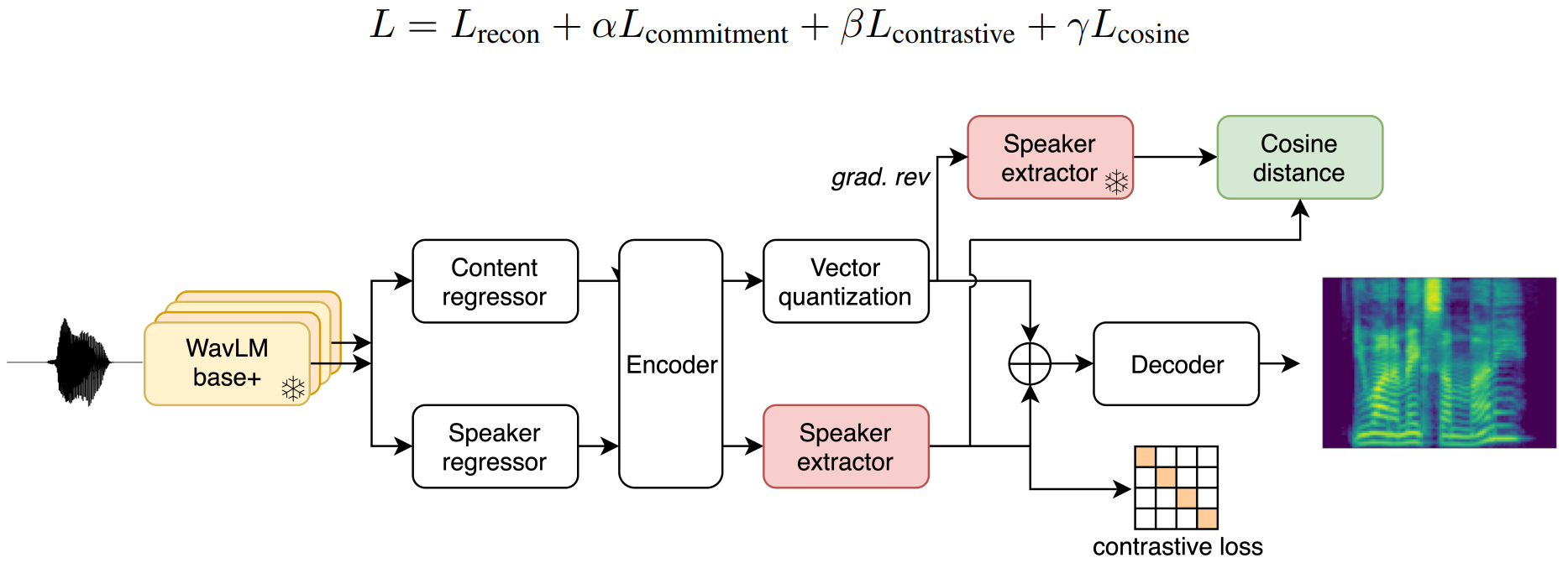 벡터 양자화를 거쳐 WavLM frame마다 하나의 speechcode를 생성. 이를 speaker embedding과 다시 결합하여 재구성한다.