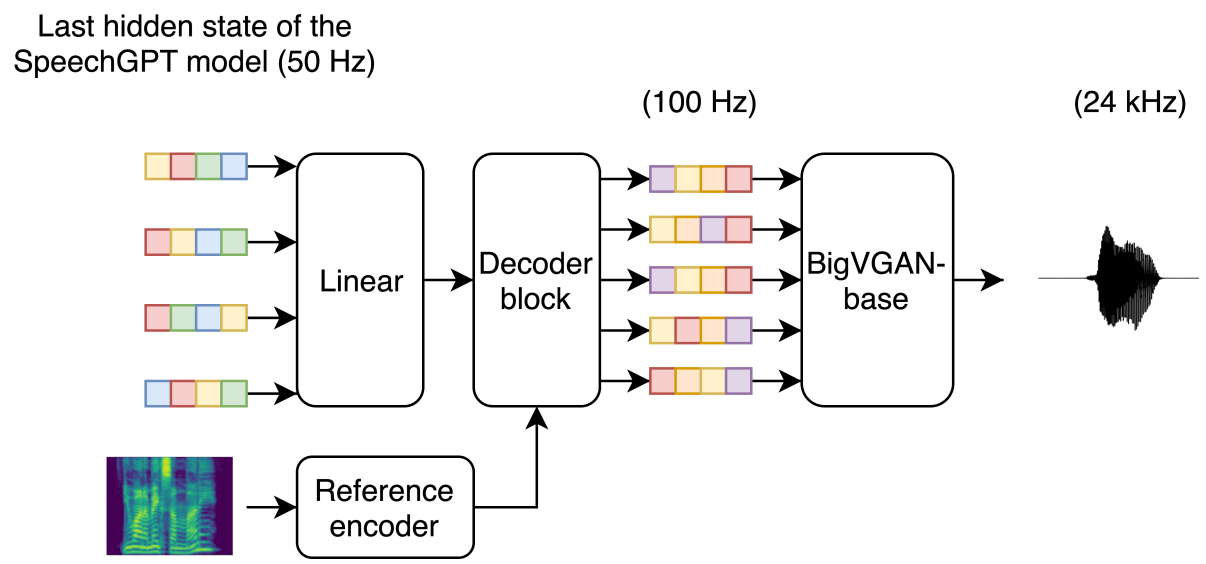 또한 SpeechGPT의 헤드 출력 대신 마지막 hidden state를 입력으로 사용한다. 밀집된 잠재 표현이 훨씬 더 풍부한 정보를 제공하기 때문이다. 이 방법의 단점은 디코더와 SpeechGPT의 버전이 종속된다는 것이다.