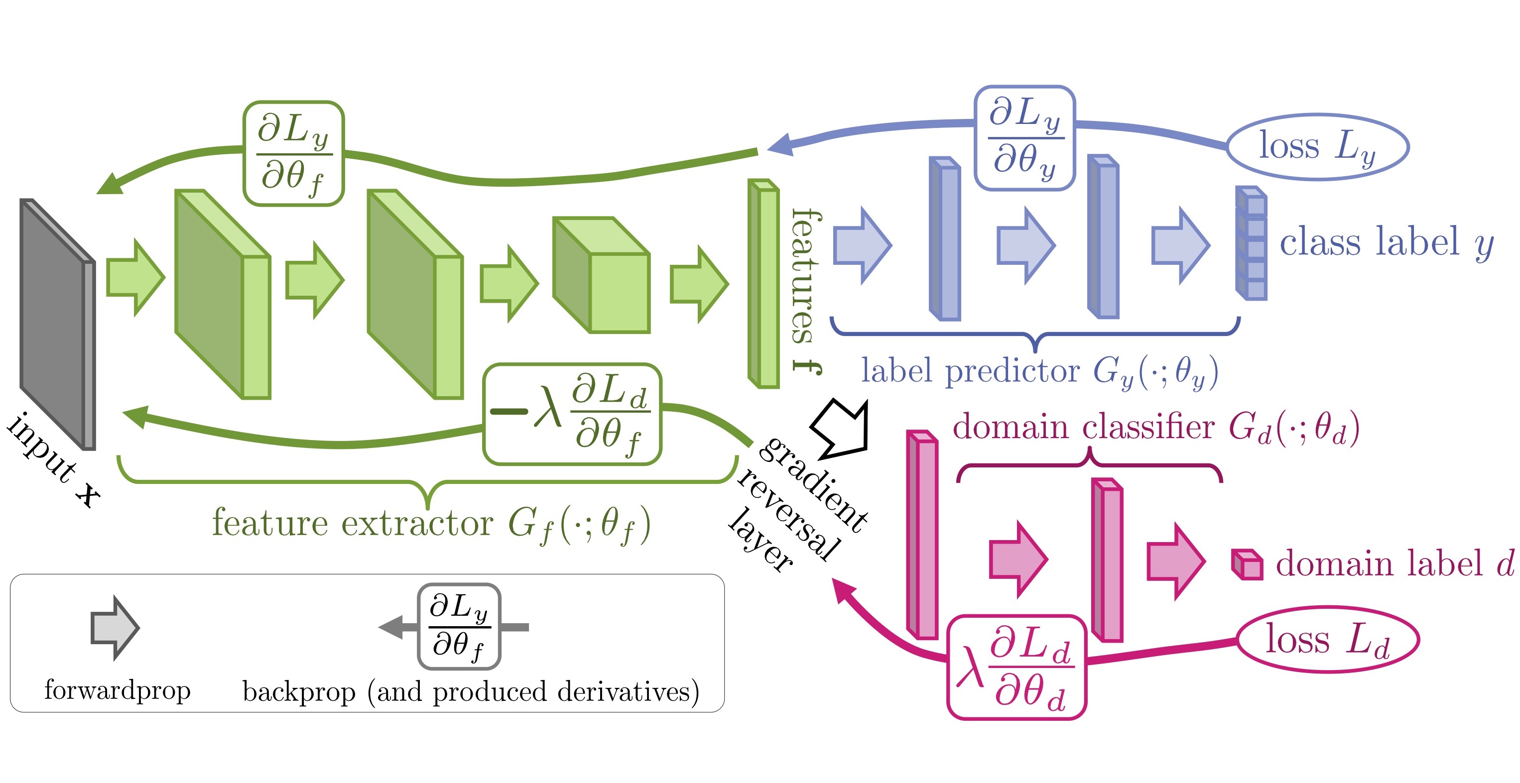 아래 그림에서 gradient reversal layer는 분류 성능은 높이면서 도메인 구분 성능은 낮아지도록 하는 역할을 한다.