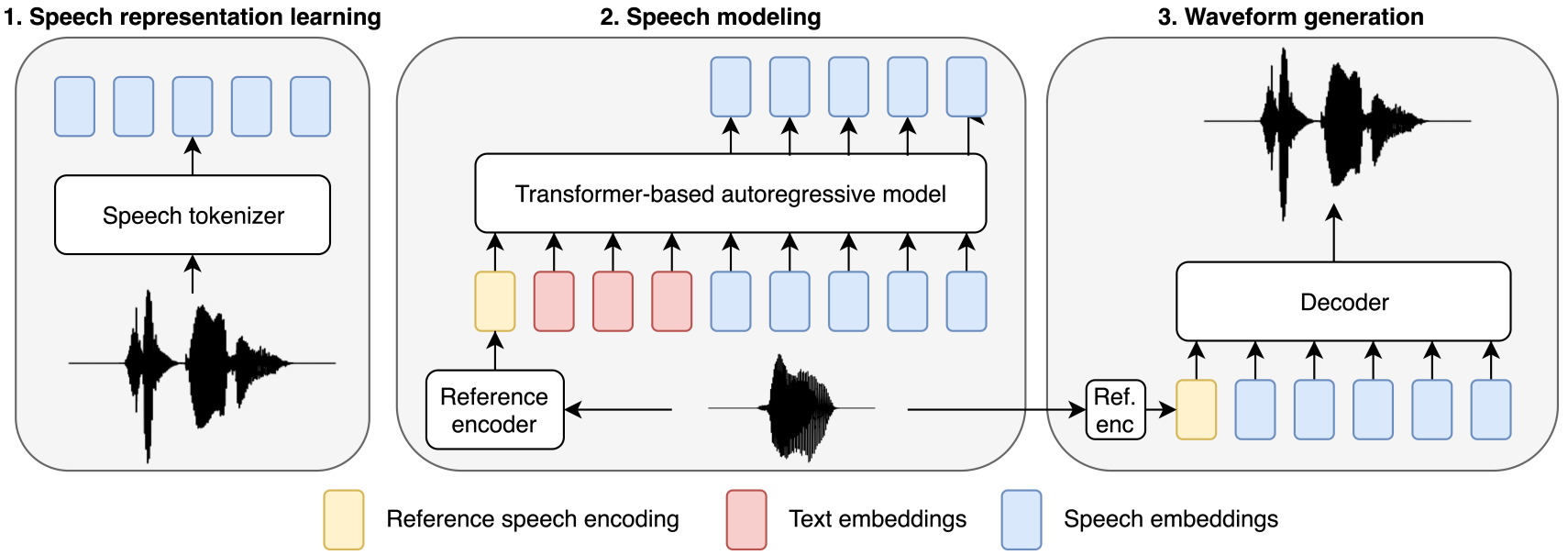 또한 운율을 안내하는 텍스트 정보를 유지하기 위해 다음 텍스트 토큰을 예측하는 목표로도 훈련되어 부분적으로 텍스트 전용 모델이 되도록 한다.