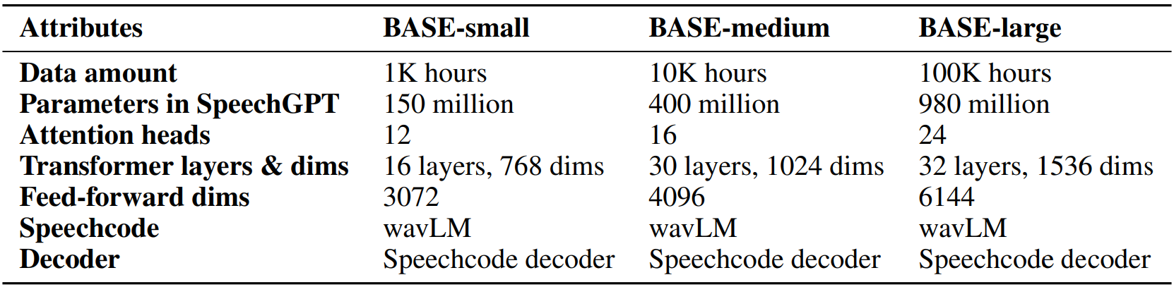 SpeechGPT라고 부르는 GPT2-architecture autoregressive model은 참조 음성, 텍스트, speechcode를 입력으로 텍스트, speechcode를 출력할 수 있으며 텍스트와 음성에 별도의 위치 임베딩과 예측 헤드를 사용한다.