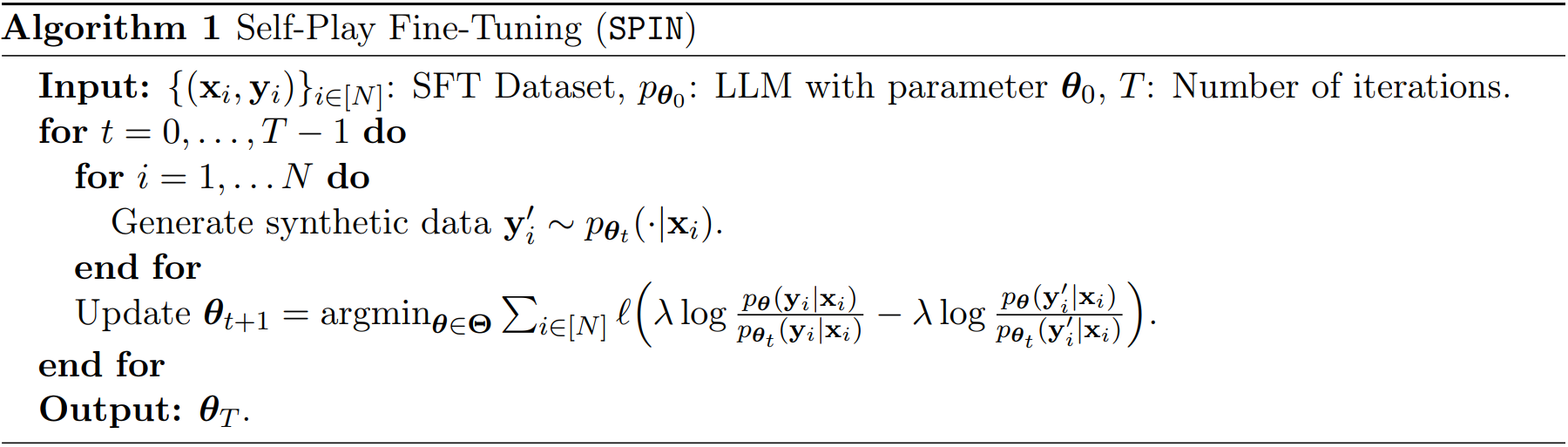 SPIN은 DPO와 비슷하지만 positive-negative pair가 필요한 DPO와 다르게 SFT dataset에만 의존한다.