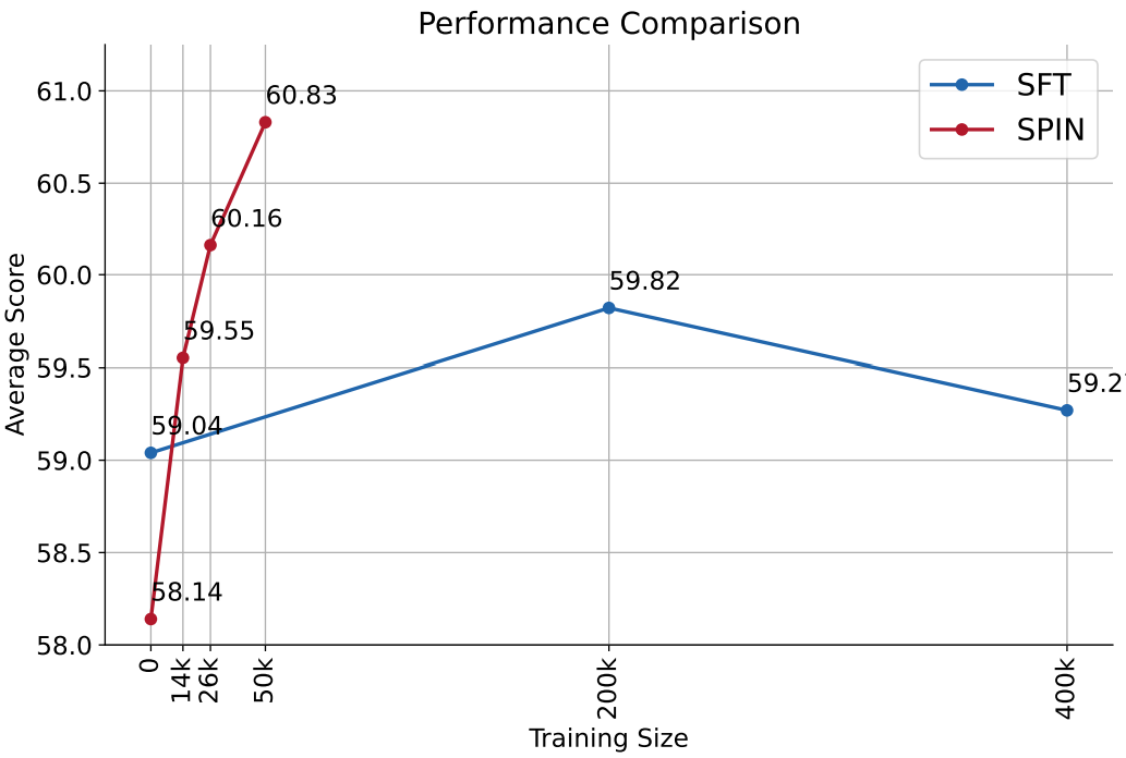 SFT data를 활용한 self-play mechanism을 통해 성능을 점진적으로 향상시키는 SPIN (Self-Play fIne-tuNing) 제안