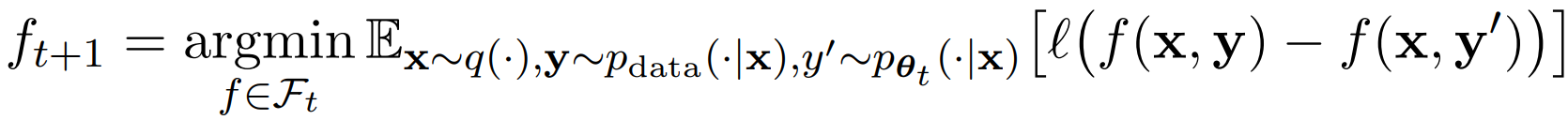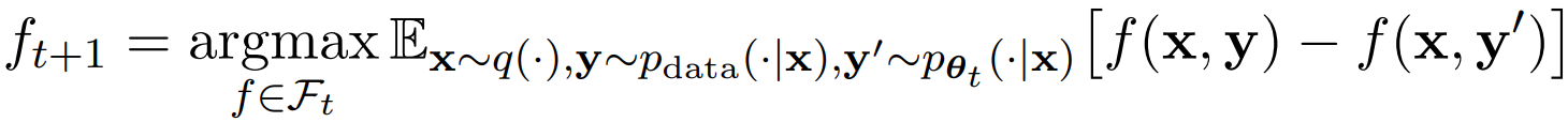 Main player는 목표 데이터 분포의 응답 y, opponent player의 응답 y' 간의 차이의 기댓값을 최대화하도록 훈련된다.