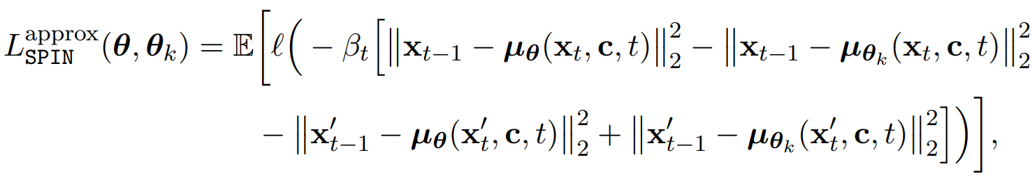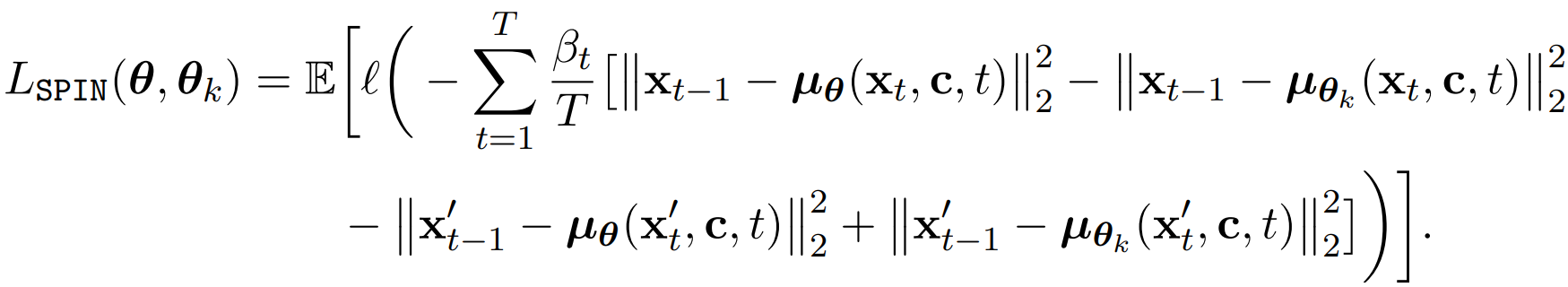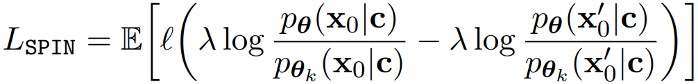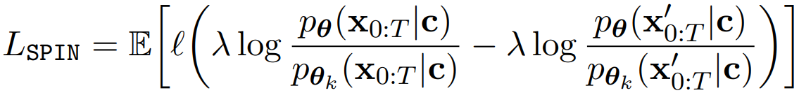 SPIN을 확산 모델에 그대로 적용하는 것에는 한 가지 문제가 있다. LLM에서는 확률 pθ(x0|c)를 얻기 쉽지만, 확산 모델에서는 모든 timestep의 궤적을 계산해야 하므로 다루기 어렵다.