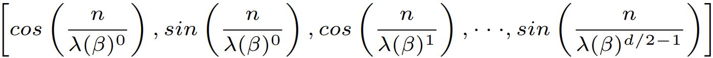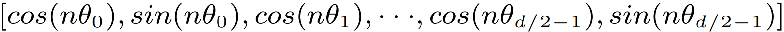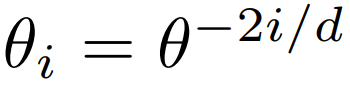임베딩 차원 d, 토큰 위치 n, 회전 주파수(=회전율, 회전 각도. 차원 i가 작을수록 주파수와 회전각이 크다)가 다음과 같을 때,
