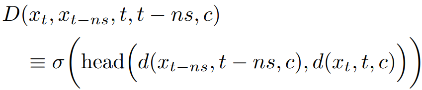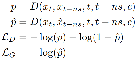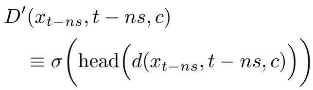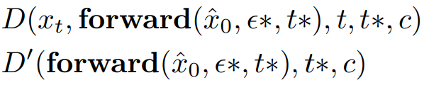 학생 예측 x̂t-ns와 교사 예측 xt-ns에 대해 판별자 D는 주어진 조건 (xt, c)에서 교사로부터 생성된 이미지인지 판별한다.