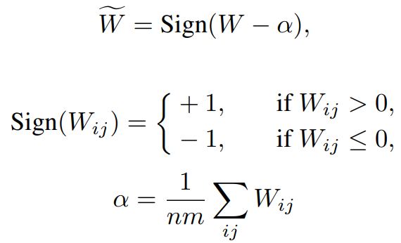 가중치 W의 평균을 0으로 바꾸고 이진화 후 역 양자화 시 β로 스케일링.