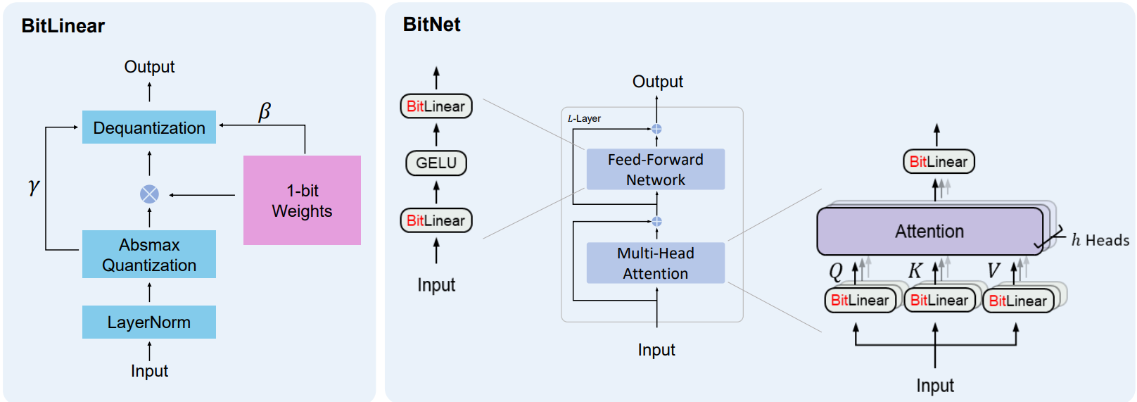 아래 그림과 같이 linear 한 연산들을 BitLinear로 교체한다.