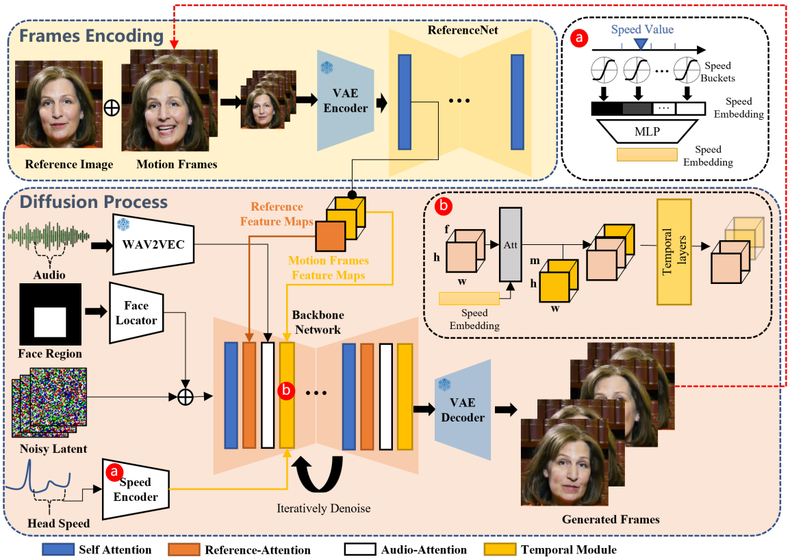 2. 부드러운 모션을 생성하기 위해 얼굴의 회전 속도를 오디오와 유사하게 임베딩하고 cross-attention으로 주입한다.
