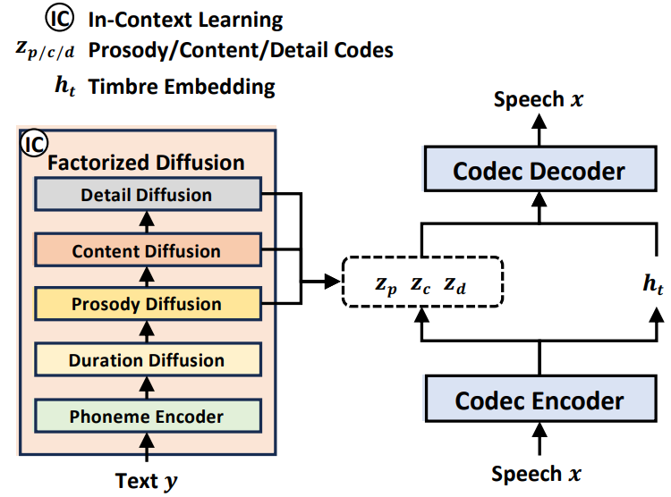FACodec, factorized diffusion model로 구성됨.
