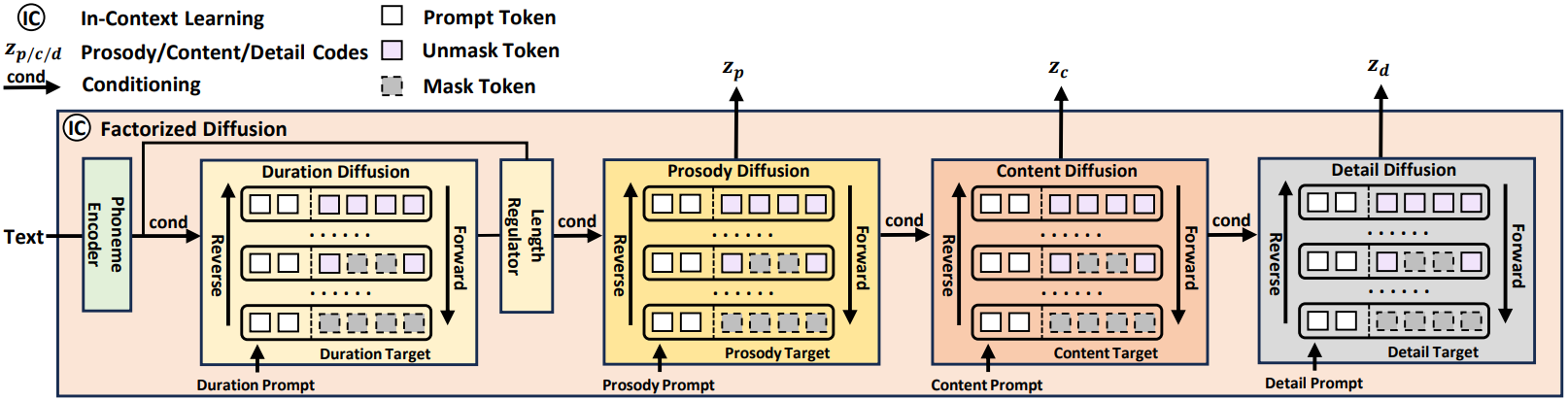 Non-AR 방식이기 때문에 duration을 먼저 생성, 직관적으로 detail이 마지막에 생성되어야 하며, 음색은 FACodec으로 prompt에서 직접 얻을 수 있기 때문에 명시적으로 생성하지 않는다.