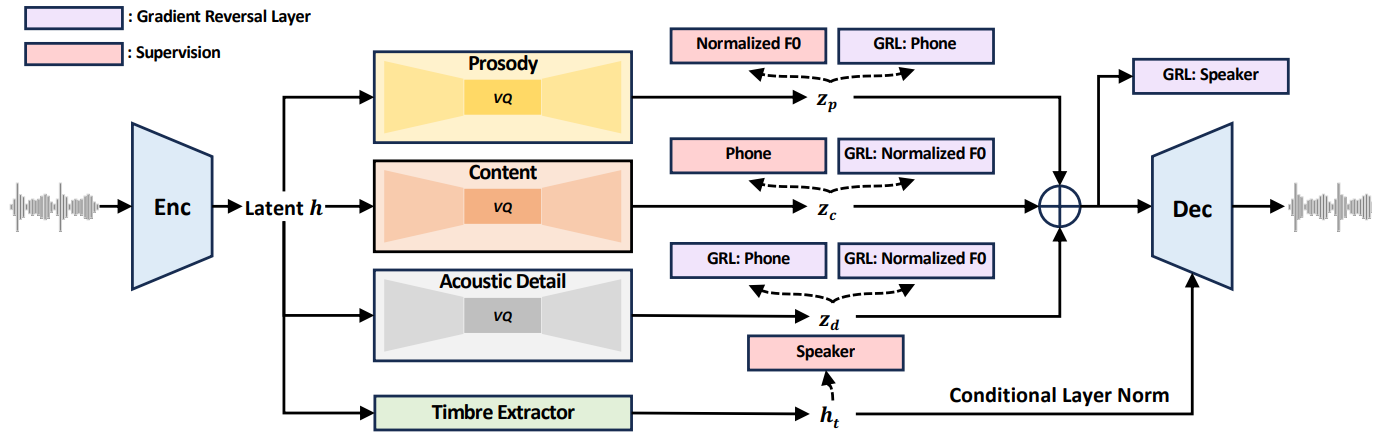 - Gradient Reversal: 원하지 않는 정보를 분리하기 위해 gradient reversal을 적용한다. Gradient reversal을 이용한 속성 분리는 BaseTTS에서도 활용한 바 있다.
