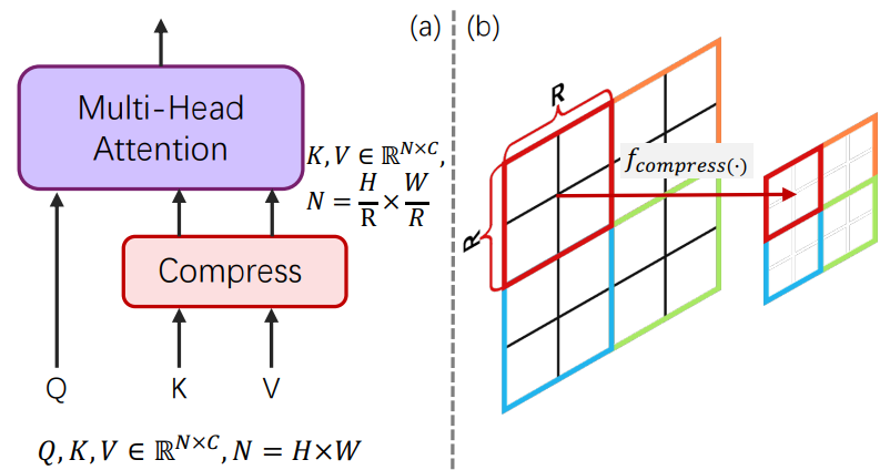 Self-attention 계산 비용을 줄이기 위해 PVTv2와 마찬가지로 K, V matrix를 압축하여 토큰 수를 줄인다.