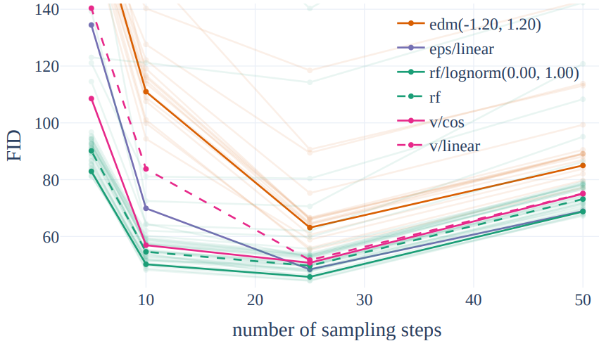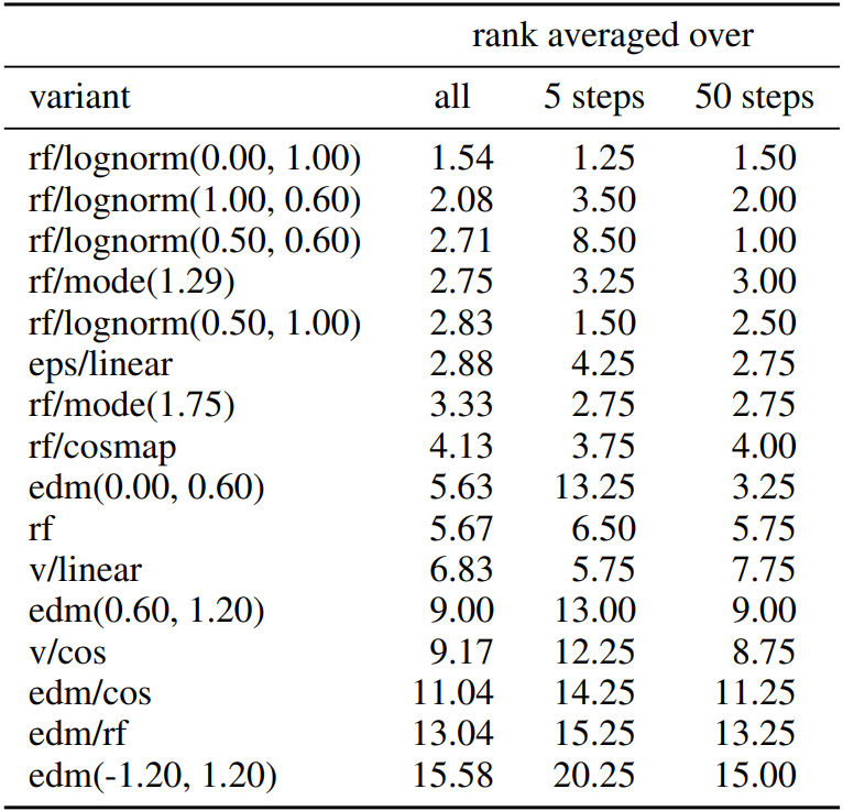 Rectified Flow / lognorm(0.00, 1.00)의 조합이 가장 성능이 좋았다.