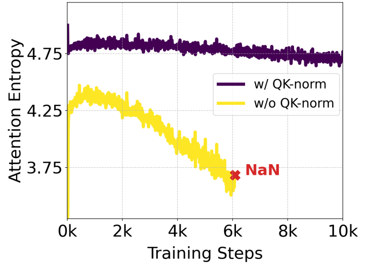 한 논문에서 이러한 문제의 원인이 attention entropy의 폭증임을 관찰했고 attention 직전 Q, K의 정규화를 제안했다. 이를 따라 스케일링 가능한 RMSNorm을 통해 Q, K를 정규화한다.