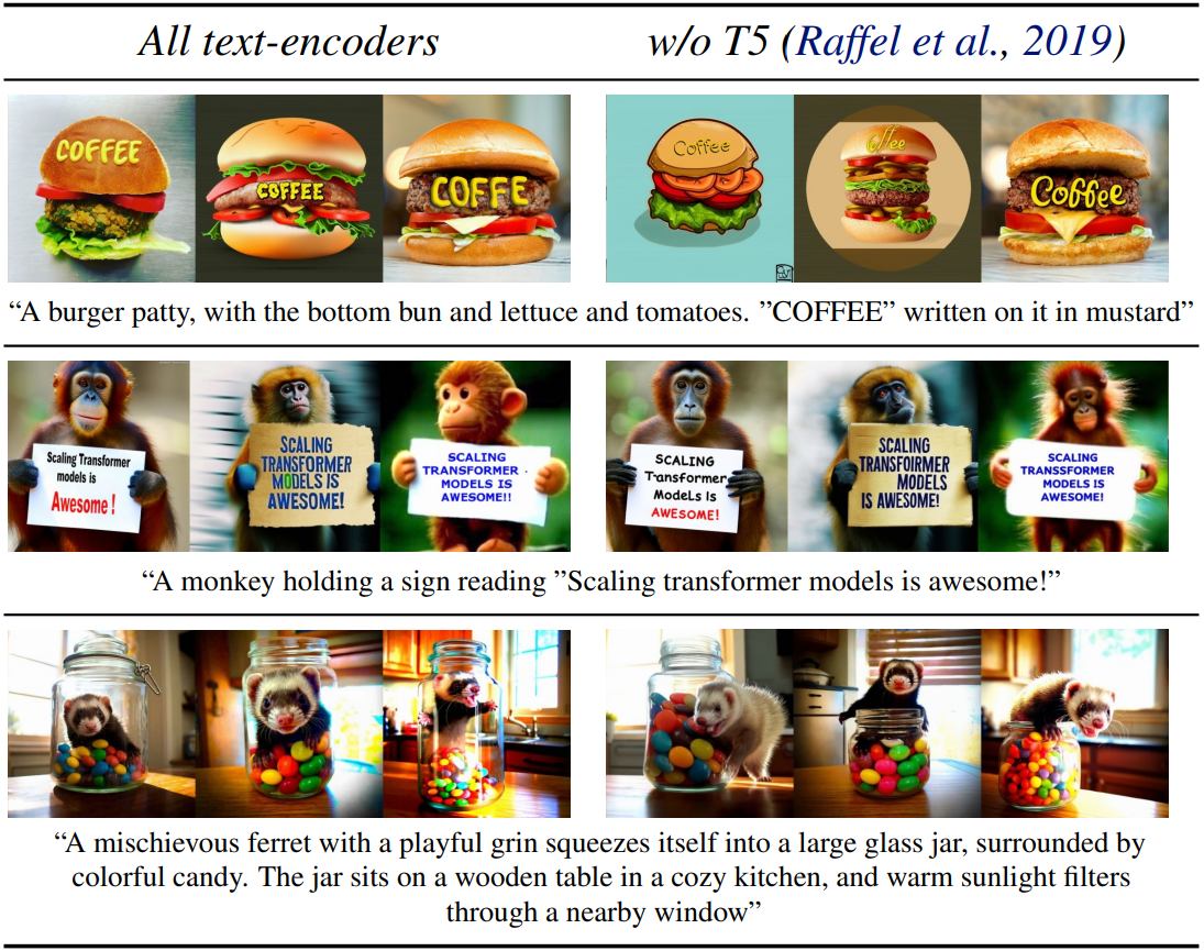 가장 많은 메모리를 차지하는 T5를 제거해도 미적 품질에는 거의 영향이 없지만 정확한 텍스트 생성 능력은 떨어짐.