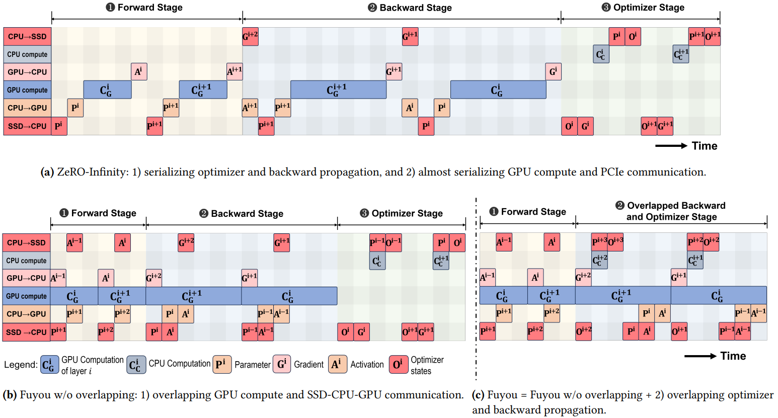 SSD I/O를 제외하면 역전파와 최적화는 완전히 다른 리소스를 사용한다. 따라서 두 단계를 최대한 중첩한다. (c)
