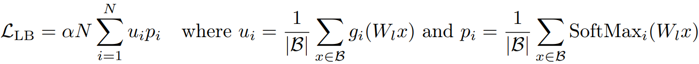 배치 B에서 각 전문가가 처리한 토큰의 비율 u와 라우팅 확률 p의 내적으로 p가 uniform일 때 최소가 된다.