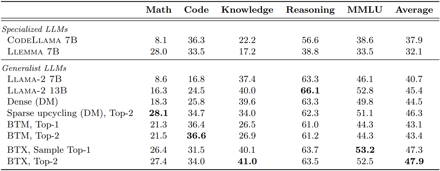 Math, Code, Wikipedia 도메인에 대해 훈련하며 시드 모델인 LLaMA-2와 함께 4개의 전문가 사용.