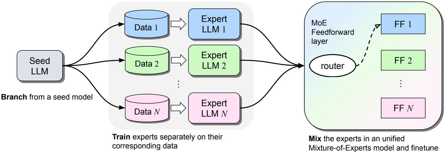 Branch-Train-Merge와 Mixture-of-Experts를 결합하였다.