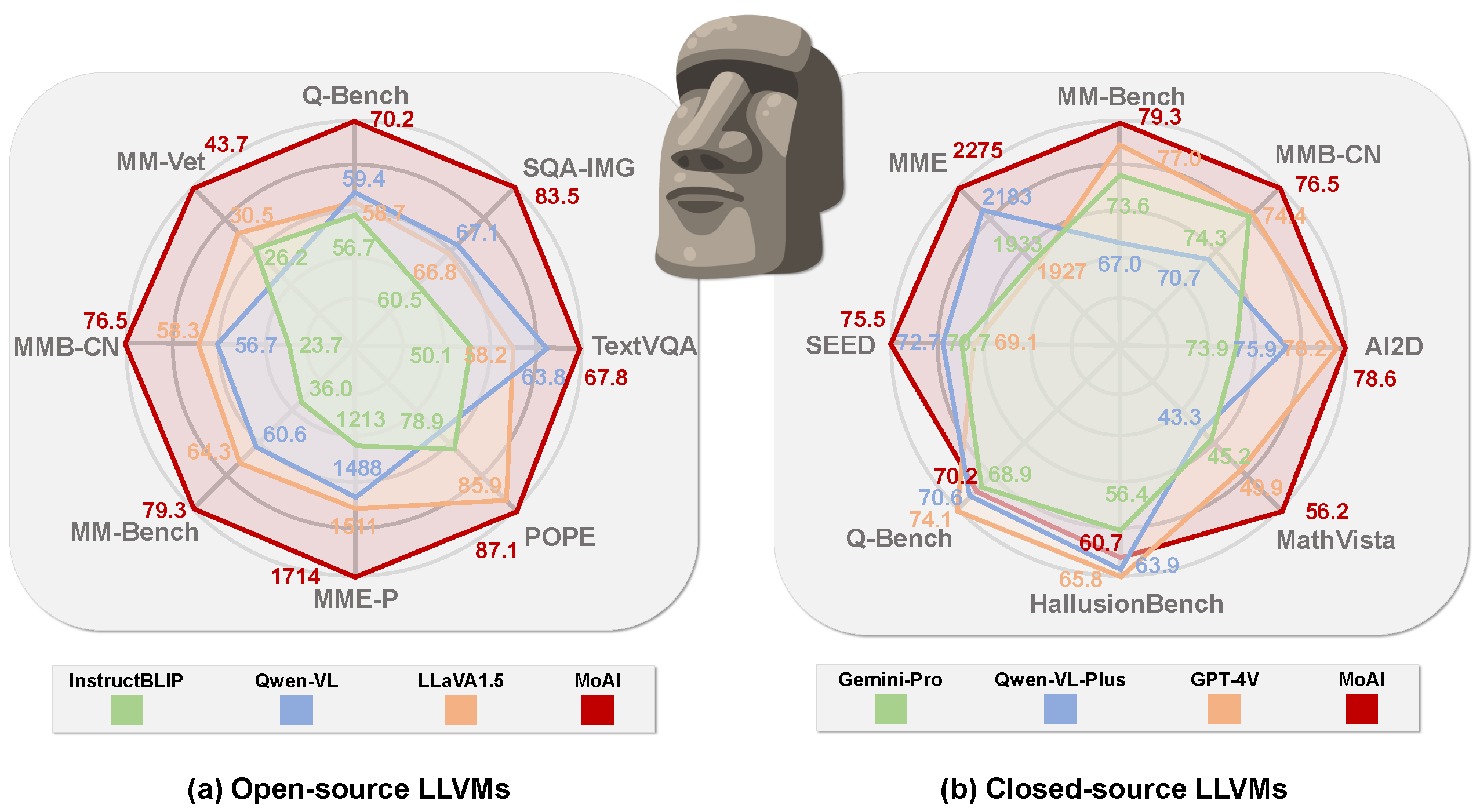 Detection, OCR 등의 외부 CV 모델의 출력을 언어화하여 Vision-Language task에 활용하는 MoAI (Mixture of All Intelligence) 제안