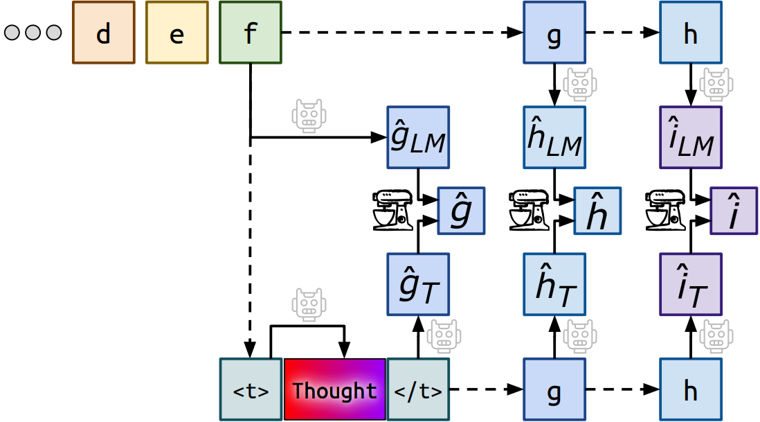 처음에는 '생각'에 대해 익숙하지 않으므로 성능이 저하된다. 생각 체제로의 원활한 전환을 위해 생각이 있는 예측과 없는 예측의 각 logits에 대한 가중치를 출력하는 간단한 MLP인 mixing head를 사용하여 두 logits을 선형 보간한다.