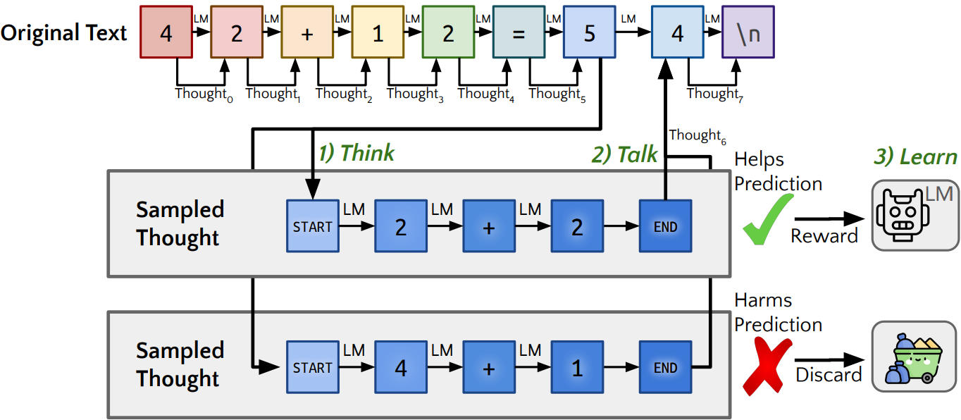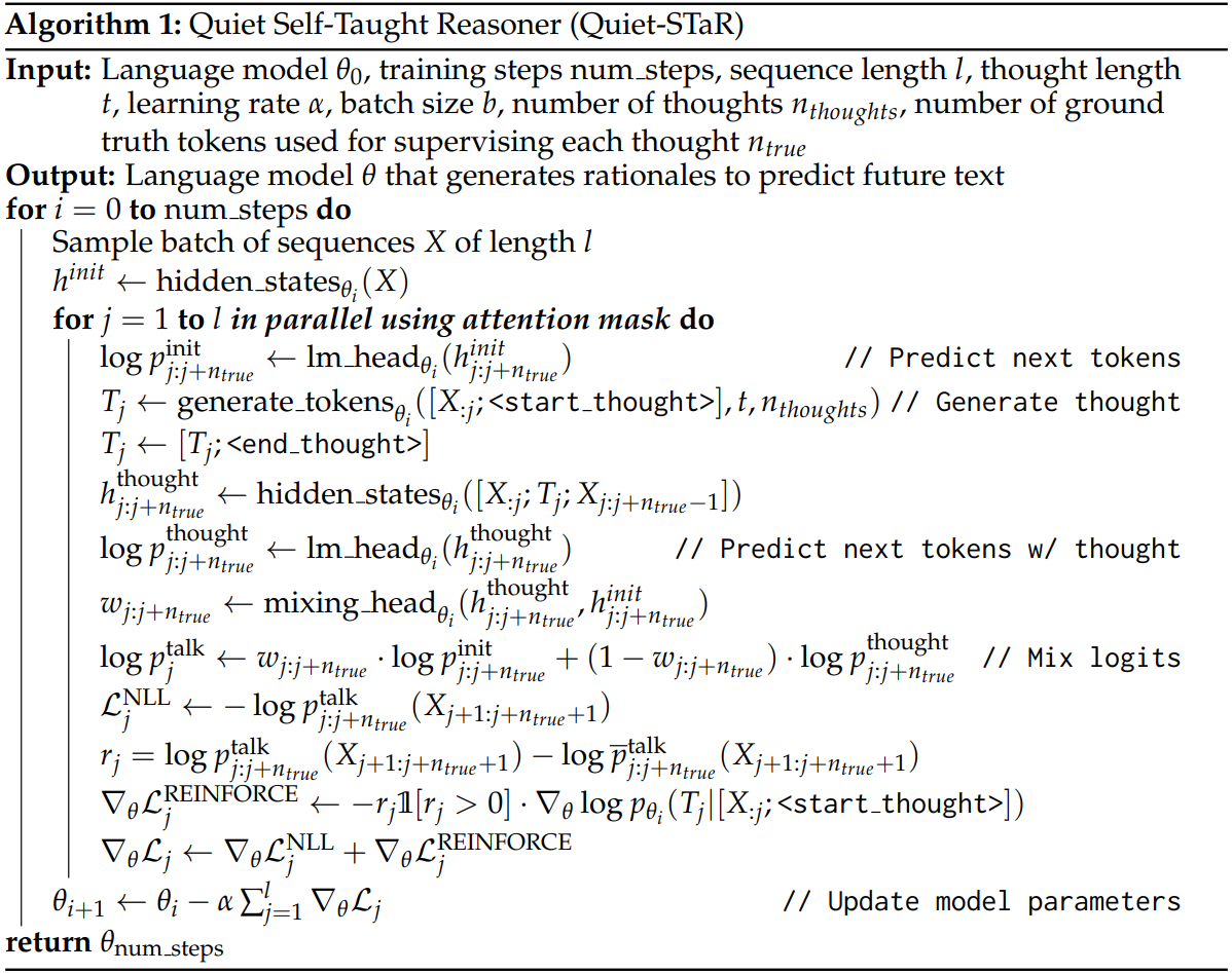 LLM이 prompt를 읽거나 답변을 생성할 때 내부적으로 근거를 생각하며 추론하도록 하는 Quiet-STaR 제안