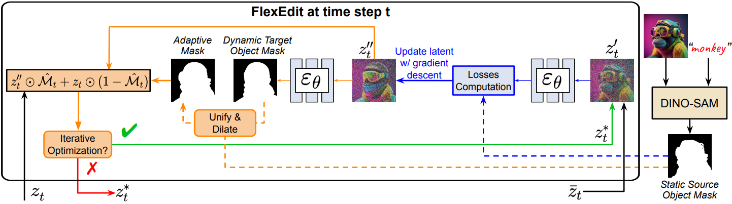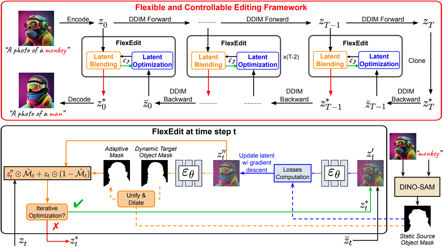 각 step에서 latent를 반복적으로 조정하여 다양한 편집 작업이 가능한 프레임워크인 FlexEdit 제안