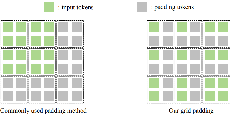 가장자리의 grid에 패딩 토큰만 존재하는 경우를 방지하기 위해 가장자리 근처의 각 grid에 패딩을 적절하게 배치하는 grid padding을 사용.