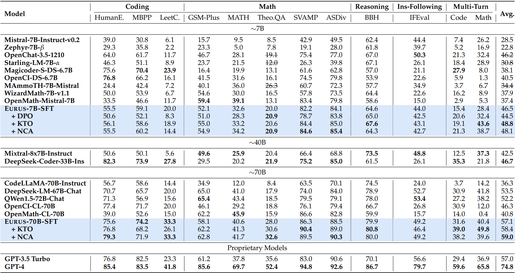 Mistral-7B에서 UltraInteract data를 통해 SFT → Preference Learning 수행.