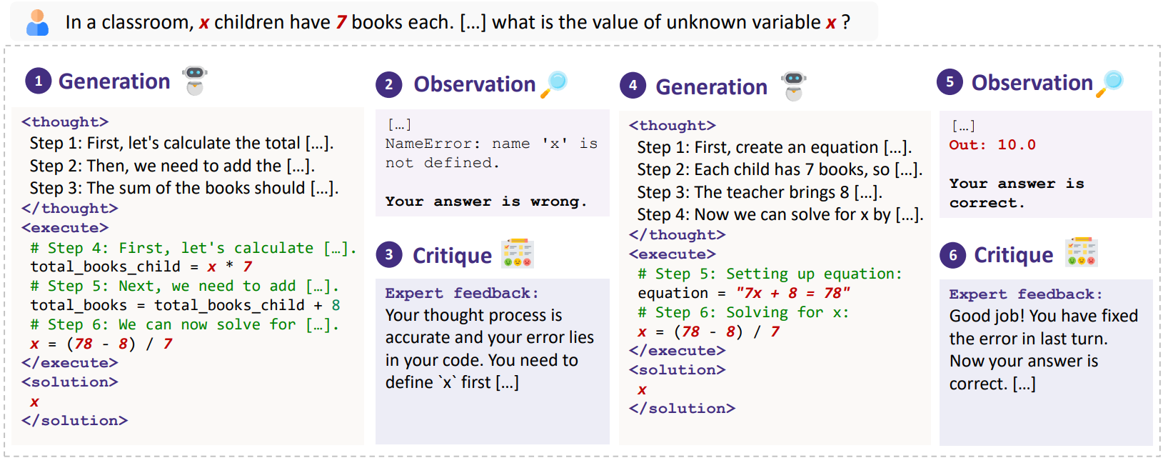 Actor model(= GPT-3.5-Turbo)이 CoT 등의 기술을 활용해 문제를 최대한 해결하고, critique model(= GPT-4)은 observation(e.g. Python interpreter)을 고려하여 오류를 찾고 개선을 위한 방법을 제안한다.