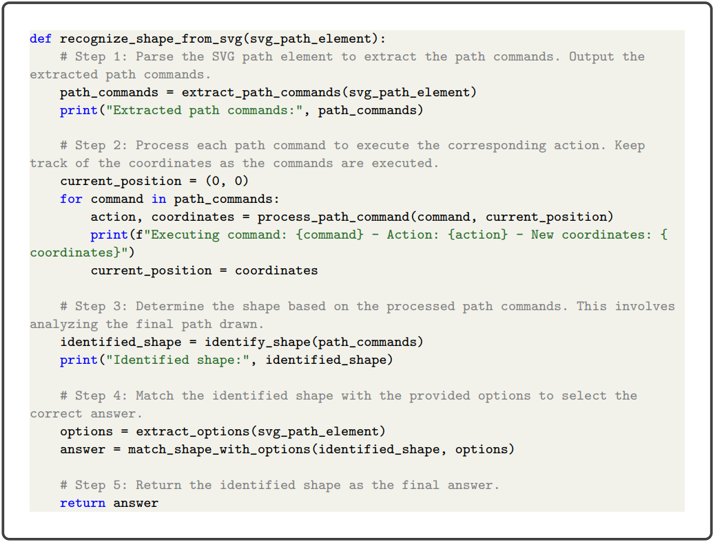Reasoner LM R은 의사 코드 P의 실행 과정을 따라 각 단계의 print()의 출력에 해당하는 순차적인 출력 목록 O = {o1, o2, ..., ok} (ok가 최종 답변)를 예측한다.