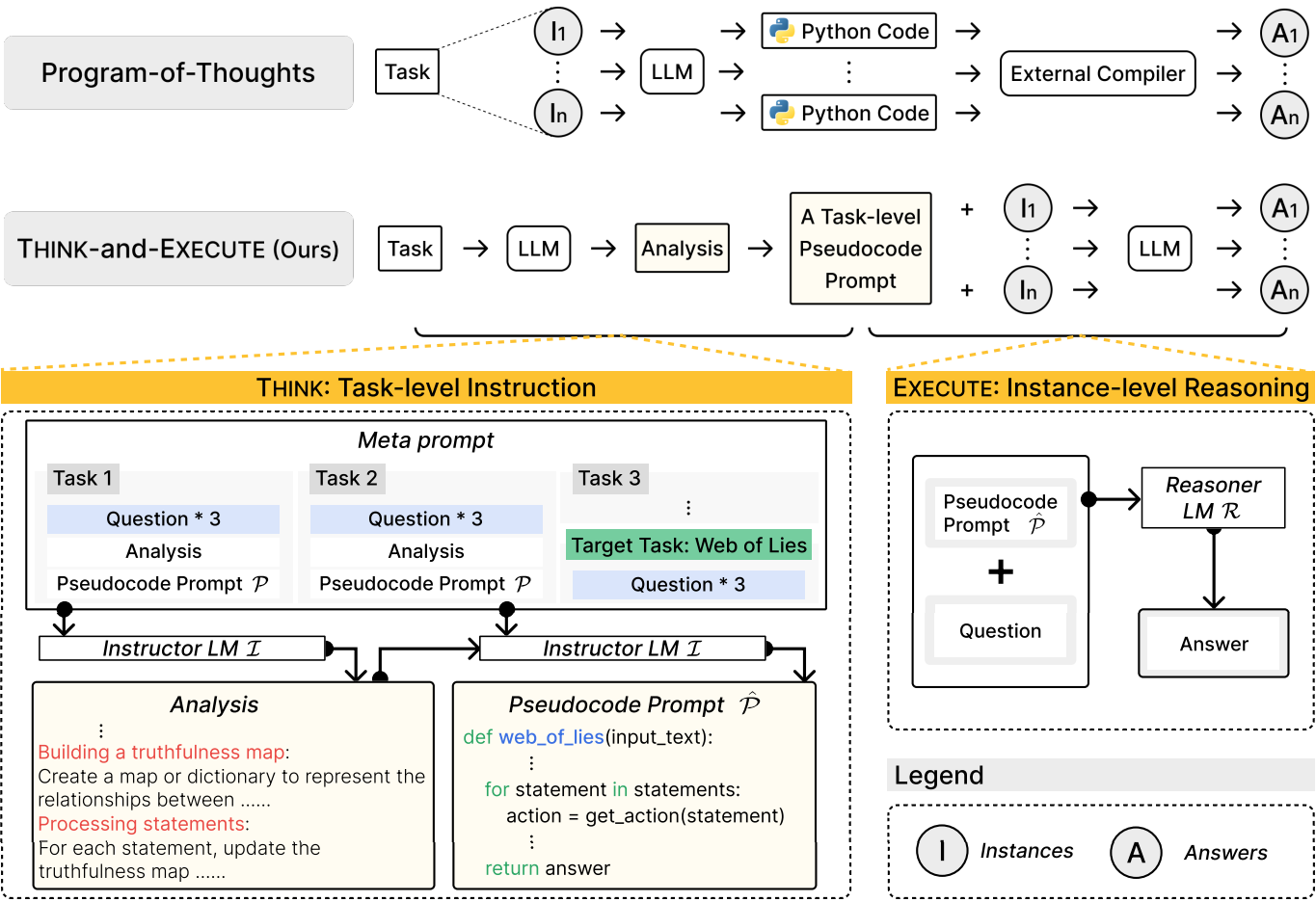 다른 작업의 질문, 분석, 의사 코드 예제를 제공하면 instructor LM I가 목표 작업을 분석하고 의사 코드를 생성한다.