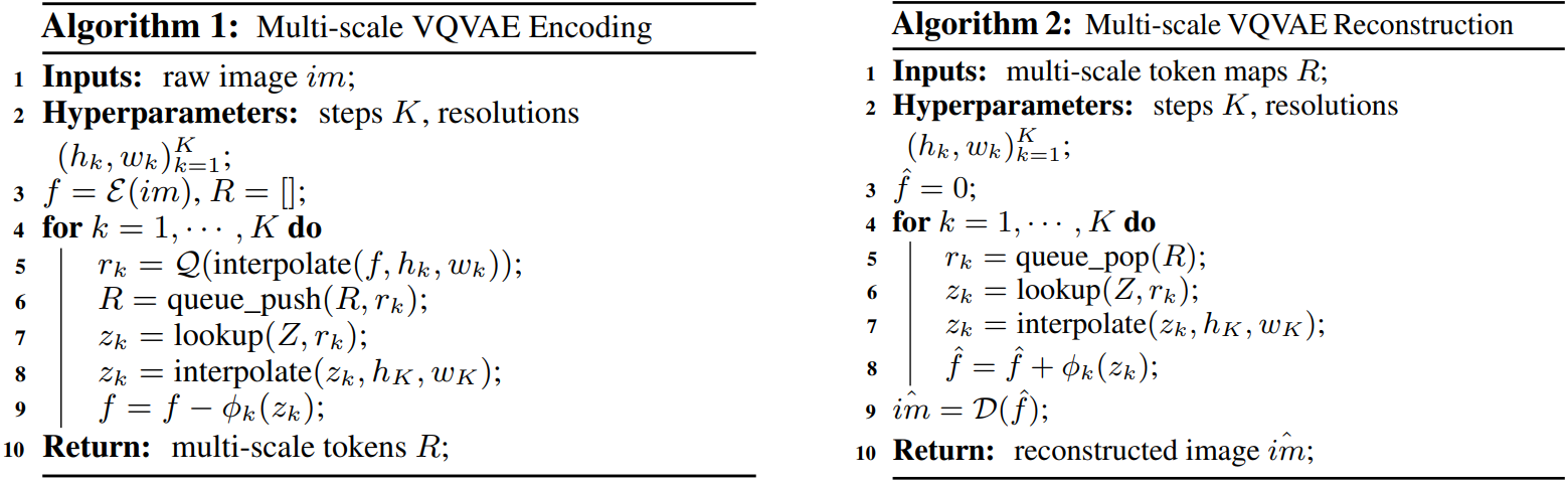 Algorithm 1: 각 단계에서 feature map을 n × n 개의 토큰으로 보간하고 양자화하여 R에 저장, 코드북 벡터와 치환하고 원본 feature map에서 뺀다.