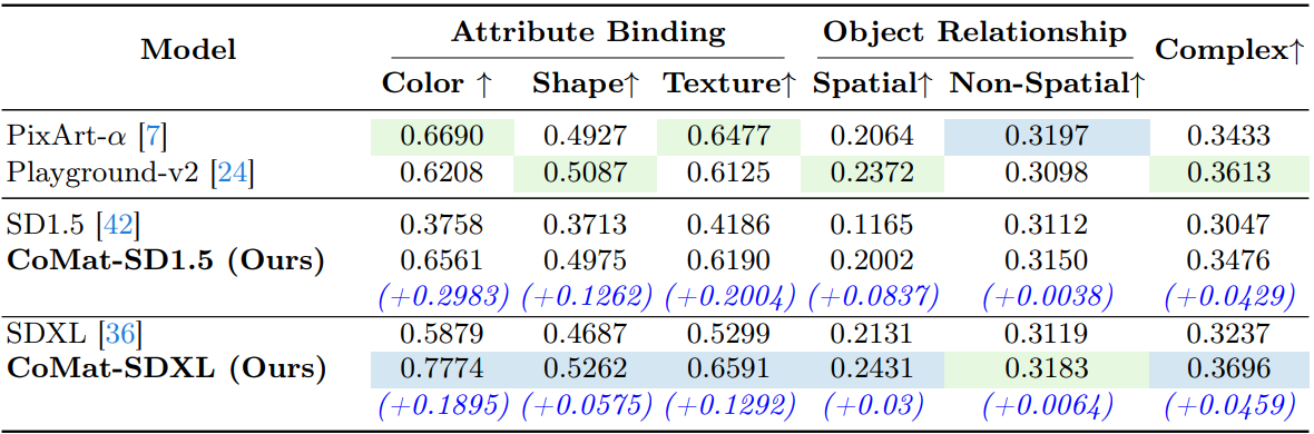 정확한 text-image 정렬을 가능하게 하는 end-to-end fine-tuning 전략인 CoMat 제안