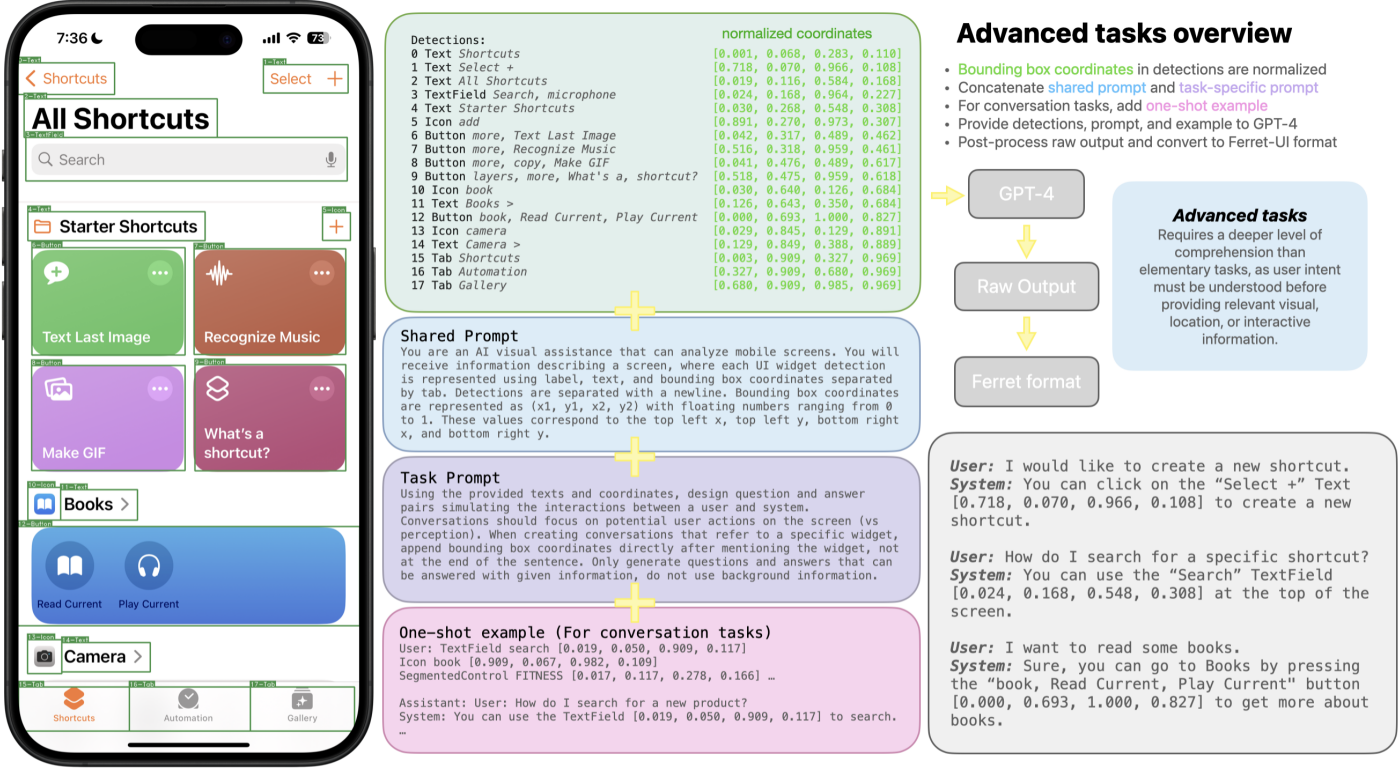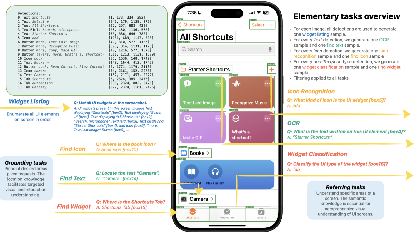 공개적으로 사용 가능한 UI dataset을 수집한 후 UI 감지 모델을 사용하여 UI 유형 (버튼, 아이콘, 그림 등) 및 표시된 텍스트를 감지한다.