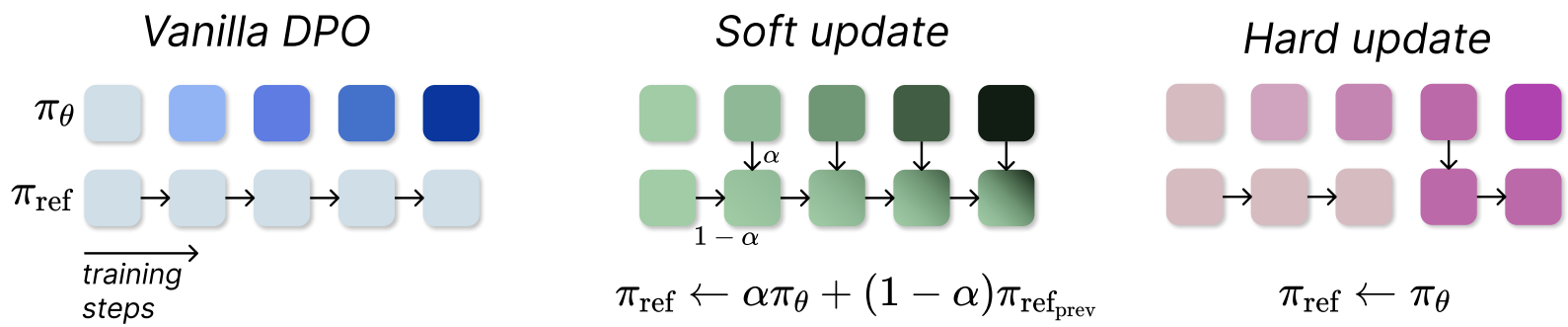 Vanilla DPO는 고정된 참조 정책을 사용하지만 본문에서는 참조 정책을 업데이트할 것을 제안한다.