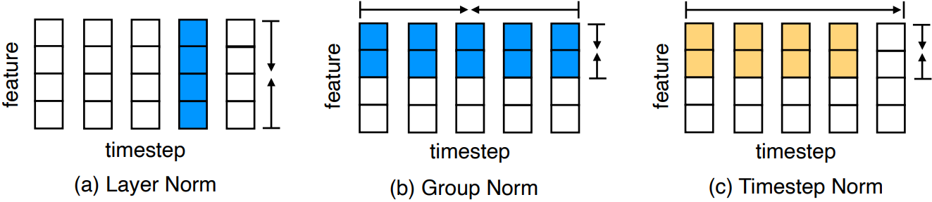 Group norm을 autoregressive modeling에 적용하기 위해 timestep norm을 고안했다.