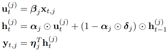 입력 시퀀스의 차원을 확장한 뒤 (β: d → h) 확장된 hidden state에 damping factor δ로 조절되는 damped EMA를 적용한다.