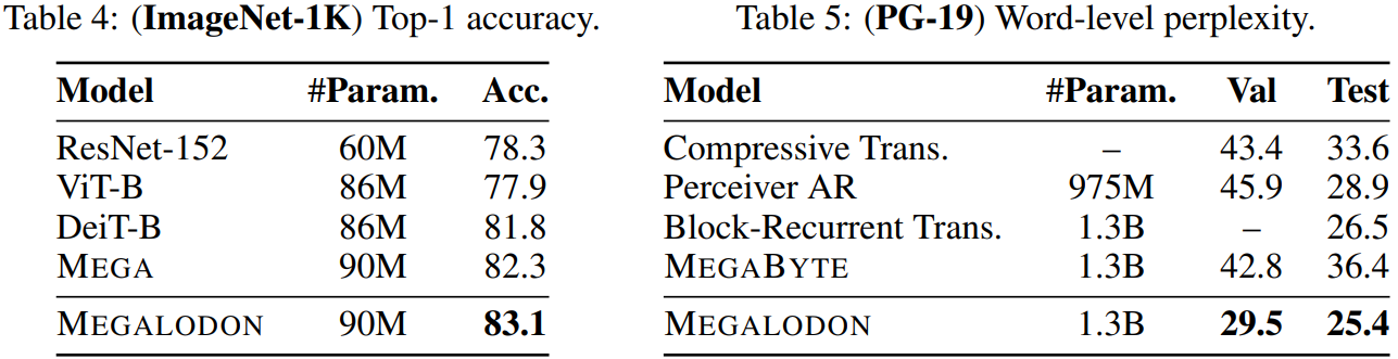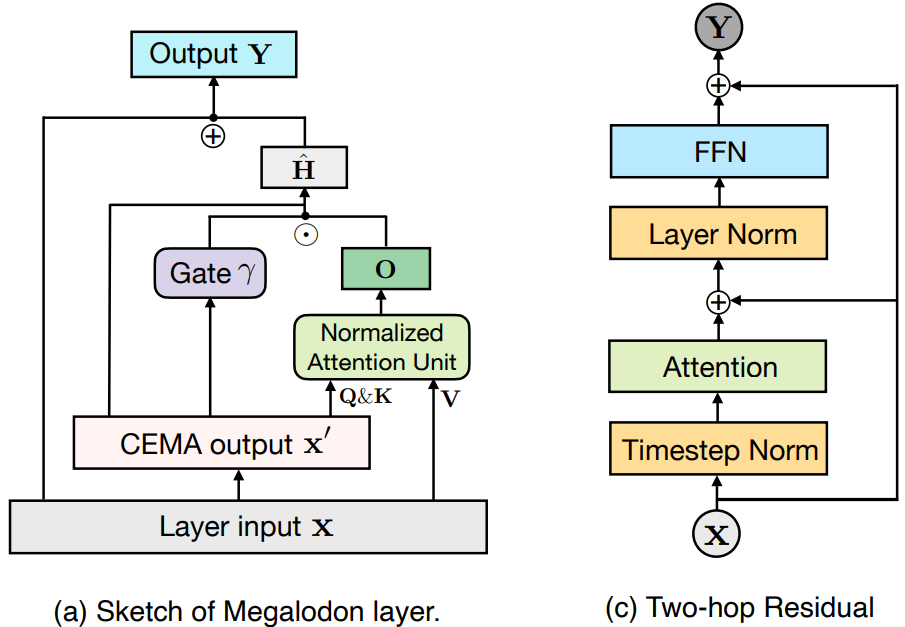 기존의 Mega를 개선하여 무제한 context 길이로 효율적인 시퀀스 모델링을 가능하게 하는 Megalodon 제안