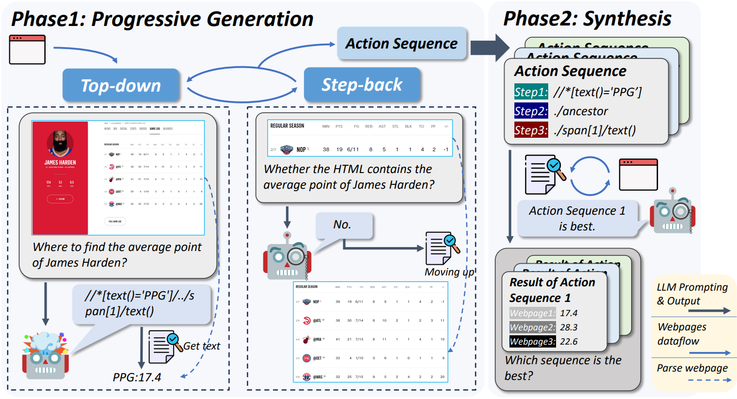 원하는 정보를 추출하기 위해 웹페이지에 대한 행동 시퀀스 A를 생성한다.